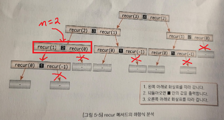 - 재귀 호출이 일어날 수 있는 가장 작은 매개변수는 n = 1일 때이다. 이때 발생할 수 있는 재귀호출은 recur(0), recur(-1) 이다