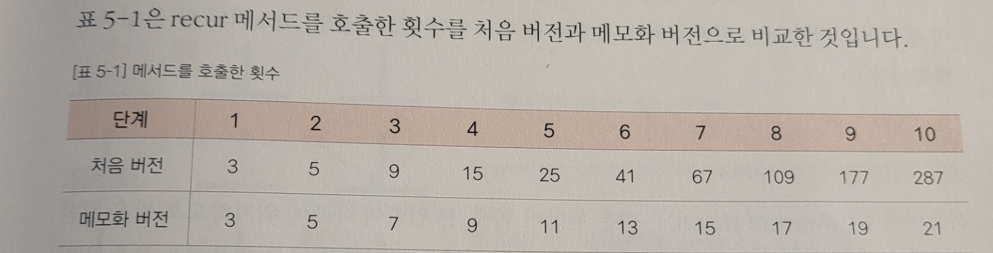 아래 표에서와 같이 메모화 기법을 사용할 경우 n값에 따라 얼마만큼의 메서드 호출수의 차이가 발생하는지 확인해볼 수 있다. 메서드 호출을 한다는 것인 JVM 호출 스택 영역을 사용해야하는 것이기에 성능, 비용등도 생각해볼 수 있을 것 같다