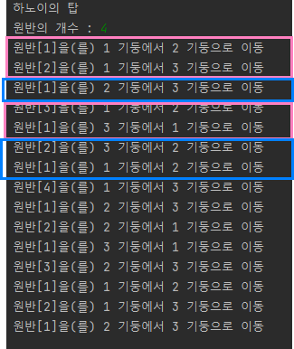 위에 출력 결과를보면 매개변수로 재귀 호출 시 넘겨주는 x , y값이 재귀호출이 반복적으로 일어나면서 어떻게 변화하는지와 원반이 어떤식으로 이동시켜야 하는지 알 수 있다고 본다.