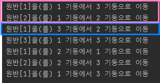 System.out.printf("원반[%d]을(를) %d 기둥에서 %d 기둥으로 이동\n",no , x , y);