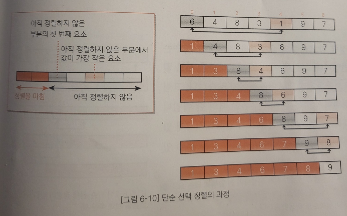 단순 선택 정렬은 두 가지 부분으로 볼 수 있다. 하나는 현재까지 정렬된 부분과 나머지 정렬해야하는 부분이다.