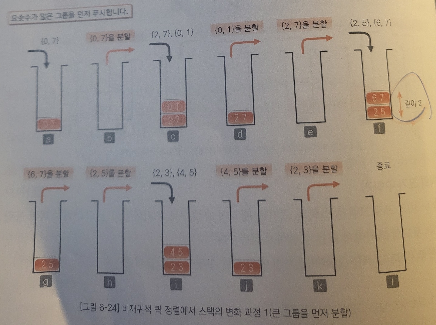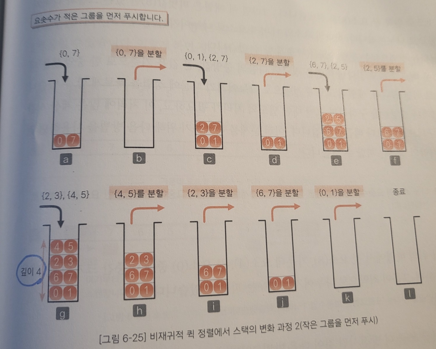위 그림과 같이 요솟수가 큰 그룹 / 요솟수가 작은 그룹 둘 중 어느 것을 택하는지에 따라 스택에 다르게 쌓이는 것을 확인할 수 있다. 최종적으로 스택에 push/pop하는 횟수는 같다. 그러나 스택에 최대로 쌓이는 수에는 차이가 있다. 당연히 요솟수가 적을수록 적은 횟수로 분할을 종료할 수 있다. 그렇기에 방법1과 같이 요솟수가 적은 그룹을 먼저 분할하면(=요솟수가 큰 것부터 푸시) 스택에 동시에 쌓이는 데이터의 최대 개수를 줄일 수 있다.