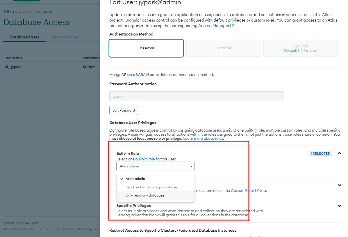 3.) 마지막으로 기존에 RDBS를 사용했을 때 각각의 대상에게 CRUD에 대한 권한을 부여할 수 있었던 부분이 생각나서 mongo atlas에서 권한관련 된 부분들을 찾아보고 확인해봤으며, 결과적으로 다음과 같은 화면에서 권한을 부여할 수 있었다.