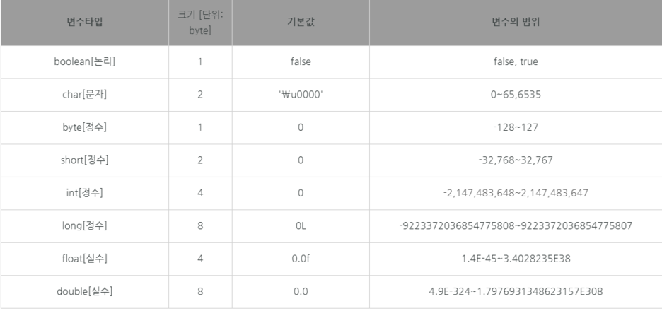 아차!! 그 전에 간단하게 기본형 변수 타입에는 어떤 것들이 있는지 아래 표를 참조해봤습니다.