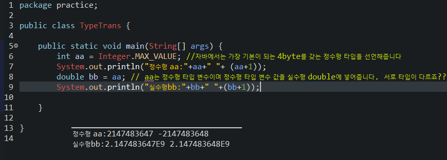 aa 변수에는 실수형 타입(double)으로 표현할 수 있는 최대 값을 받았기 최대치를 출력하고 있죠?