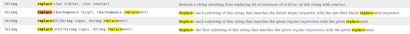다음으로 replaceAll(String regex, String replacement),replaceFirst(String regex, String replacement)를 살펴보면 매개변수로 다음과 같이 정규표현식을 통해서 변환하고자 하는 문자열을 지정하고 원하는 문자열로 변환하는 형태의 메서드인 것을 볼 수 있다. 두 개의 차이점은 메서드명에서도 알 수 있듯이 처음으로 찾은 부분만 바꾸는지, 해당되는 부분은 모두 변경하는지 차이일 뿐 두 메서드 모두 정규식을 활용한다는 것이다. 실제 설명에서도 expression이라는 단어가 있는 것을 통해서도 짐작해볼 수 있었다.