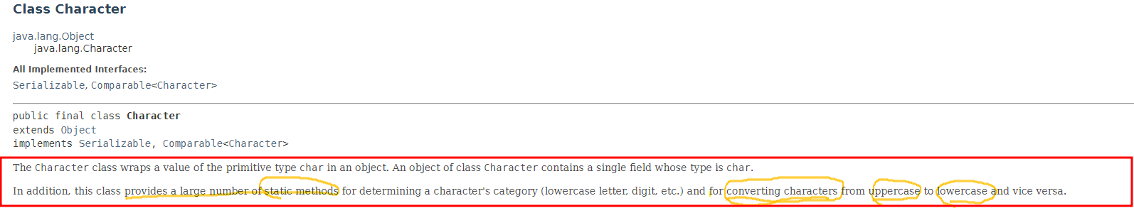 다음과 같이 java 11 Docs를 보면서 충분히 사용할 것 같은 Character 래퍼 클래스에 대한 멤버들을 정리해봤다.