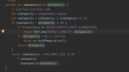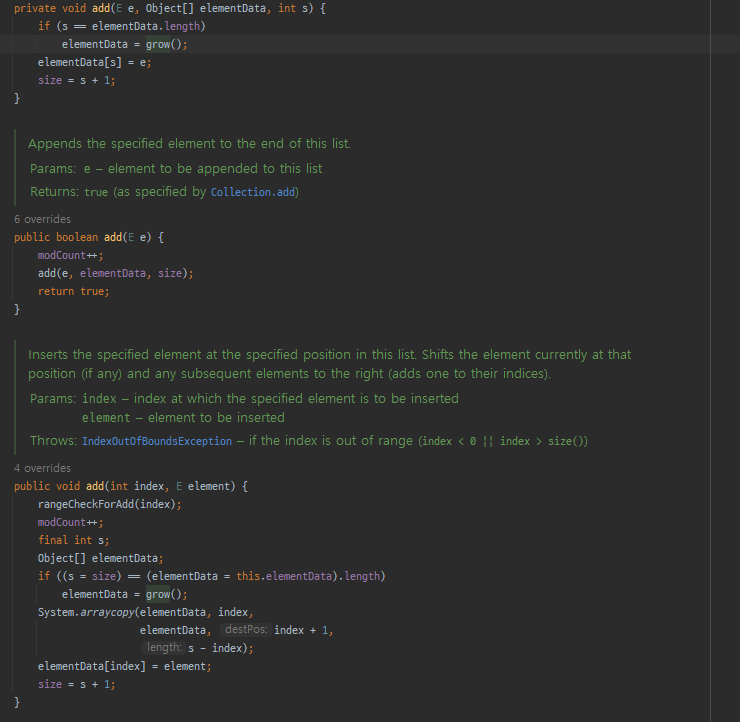 ArrayList에 객체를 추가하다보면 Object[] 배열을 사용하기 용량을 넘어서게 되면 예외가 발생하게 되는데 실제로는 발생하지 않고 계속 추가가 가능하다. 그것이 어떻게 가능한지 다음과 같이 클래스 내부의 코드들을 살펴보면서 확인해볼 수 있었다.