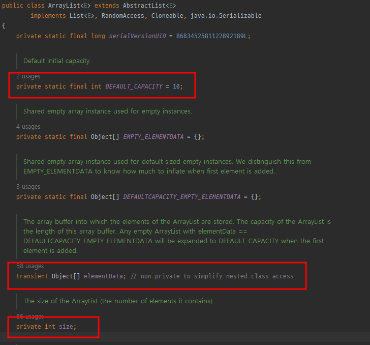실제 ArrayList 컬렉션 클래스이다. 다음 코드를 살펴보면 Default 용량은 10이며, 내부적으로 Object[] 배열을 사용하는 것을 확인해 볼 수 있고, 실제저장된 객체 수는 size라는 인스턴스 변수를 사용하는 부분도 볼 수 있다. 추가적으로 ArrayList<E>와 같이 지네릭스를 활용하고 있는 부분도 확인 가능했다.