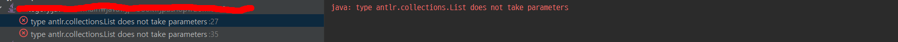 보통은 불편함을 조금이라도 해소하려고 AutoImport를 켜두고 단축키를 사용해서 빠르게 import를 진행하는데, 항상 그렇듯이 문제가 되기 전까지는 습관적으로 하는 것들이 참 많은 것 같다. 그 중 오늘은 정말 무의식적으로 하던 자동 임포트인데, 어느순간 계속 List 컬렉션을 사용하는 쪽에 빨간줄이 가기 시작했다. 우선은 인강에서도 다른 부분들에 빨간줄이 가기에 그냥 아 뭐 별거 아닌가보다 실행하면 별 이상 없이 되겠지, 인텔리제이에서 그냥 놓치지 않게 체크해주는 것이구나 하고 넘겼다. 그러나 실행을 했을 때는 java: type antlr.collections.List does not take parameters 같은 오류가 발생했다. 처음 보는 것이기에 처음에는 뭐가 문제인지도 몰랐다.