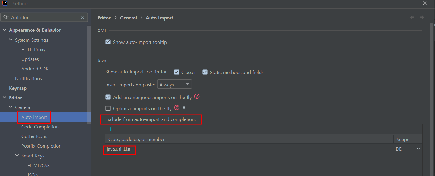 다음과 같이 간단한 부분을 찾아보고 적용해보면서 너무 간편하게 사용했던 자동 임포트 부분에 대해서 한번씩은 이와같이 다른 것이 임포트 될 수 있는 상황에서는 슬쩍 체크를 하고 넘어가거나 확인을 하고 넘어가보면 좋겠다는 생각이 들기도 하고 인텔리제이에서 Auto import 셋팅에 항상 할 것인지 체크하는 항목만 알고 체크해주었지만, 이번 상황을 통해서 제외할 대상도 지정할 수 있는 부분이 있다는 것을 알게되었다.
