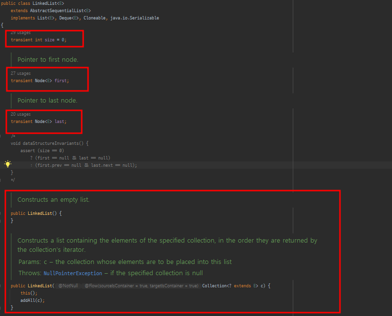 정말 많은 기능들이 있다 이러한 부분들은 LinkedList Class를 보면 Deque(Queue), List 인터페이스를 구현한 것인데 그에따라서 사용할 수 있는 메서드명을 보면 이 두가지가 함께 사용할 수 있는 메서드로 있는 것을 볼 수 있었다.